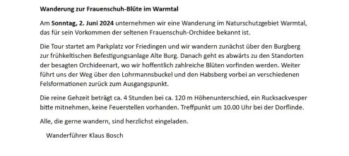 Orchideenwanderung im Warmtal bei Langenenslingen So., 02.06.2024, Die Wanderung fällt wegen des schlechten Wetters aus!!!!!!! Uhrzeit: 10:00 - 17:00 iCalendar Mit dem Laden der Karte akzeptieren Sie die Datenschutzerklärung von Google.Mehr erfahren Karte laden Google Maps immer entsperren zur Übersicht