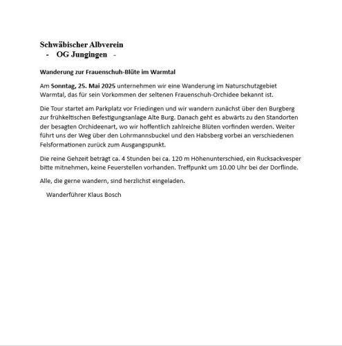 Orideenwanderung im Warmtal bei Langenenslingen So., 25.05.2025, Uhrzeit: 10:00 - 17:30 iCalendar Mit dem Laden der Karte akzeptieren Sie die Datenschutzerklärung von Google.Mehr erfahren Karte laden Google Maps immer entsperren zur Übersicht